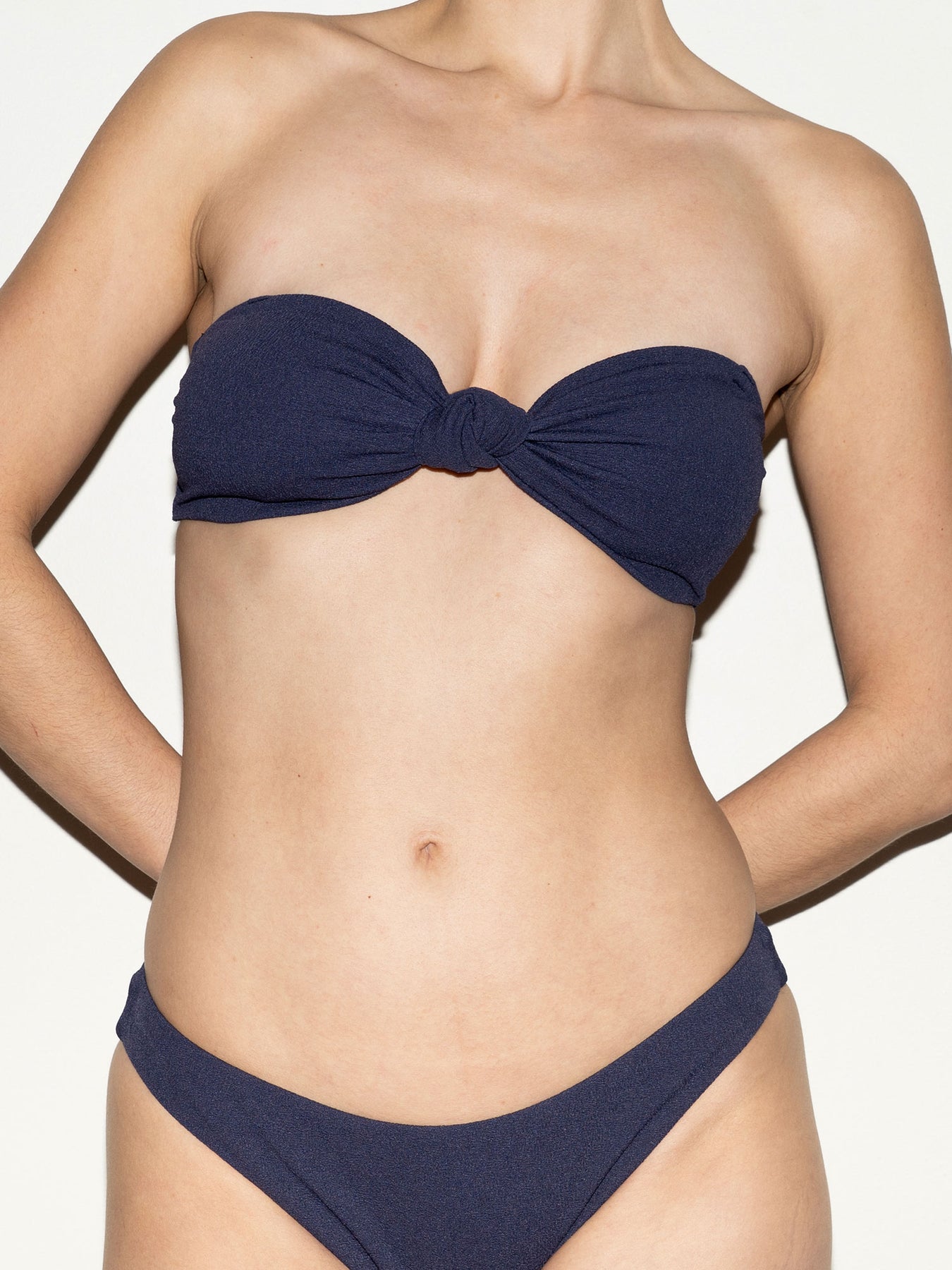 Notre bandeau de bikini Sacha bleu marine est confectionné en polyester recyclé doux, avec une jolie texture et un élégant nœud au centre. Grâce à ses bretelles amovibles, il offre une coupe parfaite, que vous soyez à la plage ou en train de nager. Complétez votre ensemble avec le bas de bikini Sacha assorti ou le tanga Sacha pour un look de plage irrésistible.